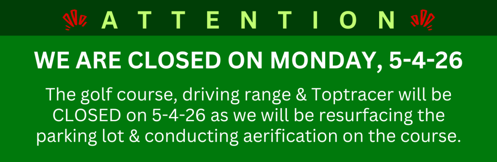 We are closed on 4-27-26 for parking lot resurfacing & course aerification.